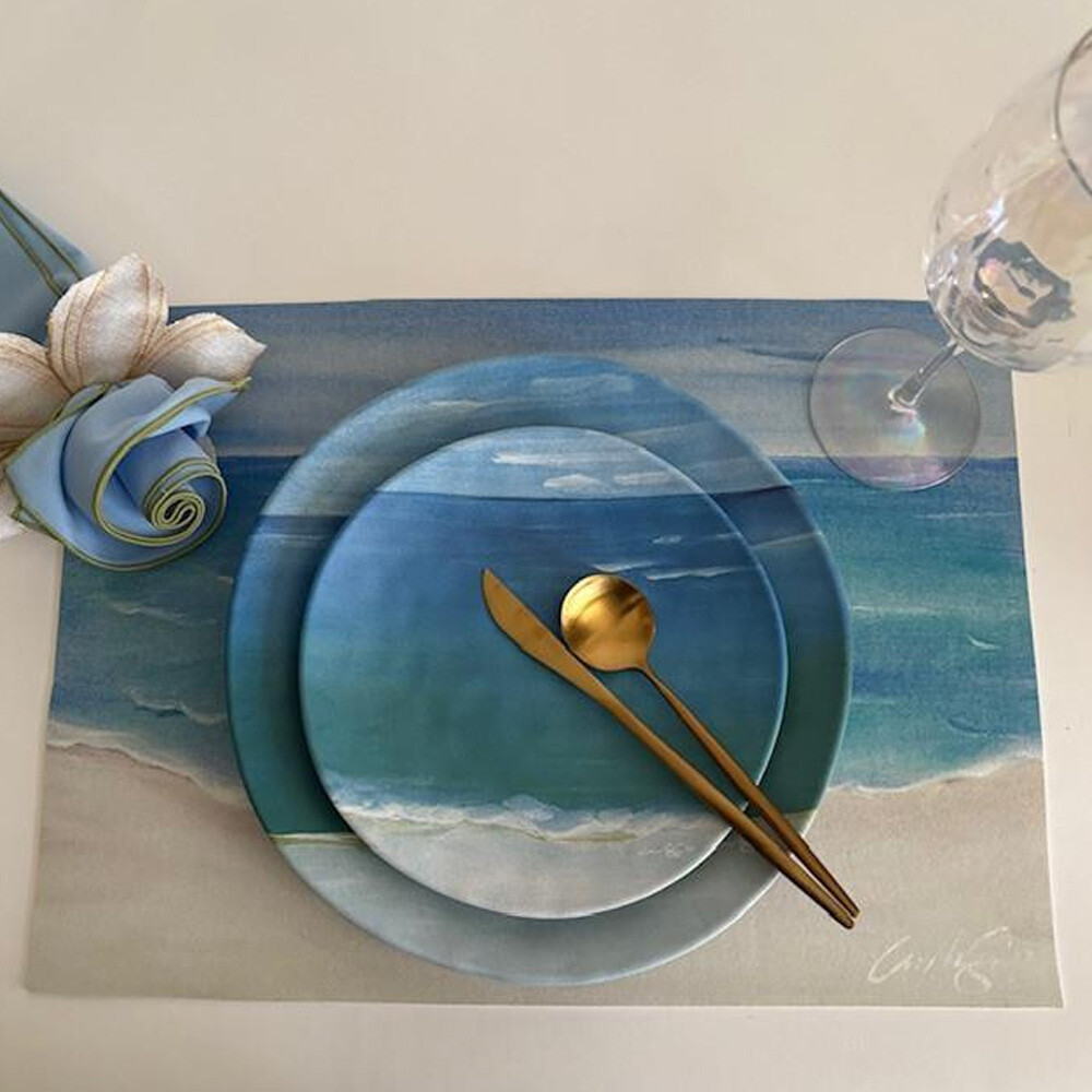 This gorgeous painterly Shoreline set takes the A Day at The Beach Placemats right over the top! Made of porcelain-like melamine, this dinner and salad plate blend right into Carole’s original placemat and sets a table like no other, truly. It’s stunning, easy-care dinnerware on a table or tablecloth as well! Dishwasher-safe and great for beach, poolside and fine dining alike!