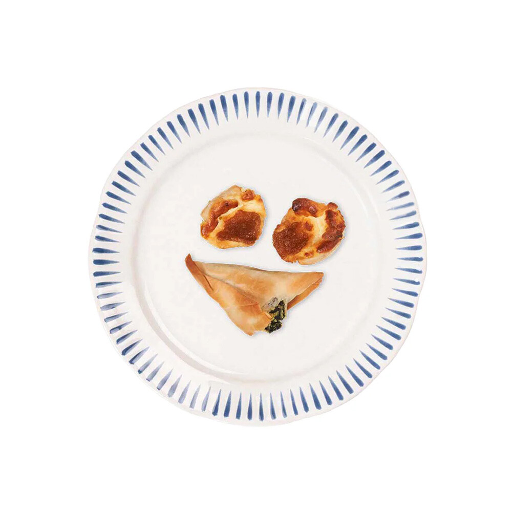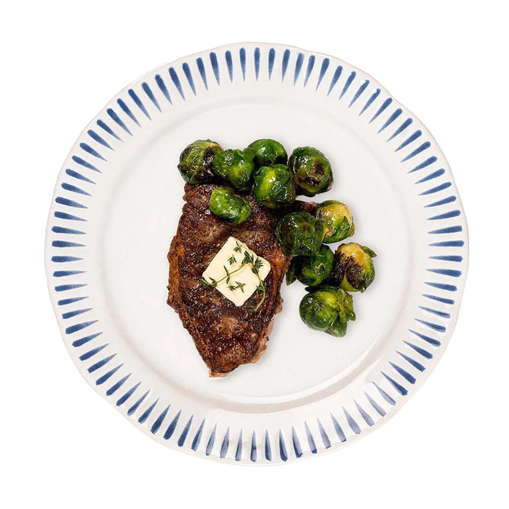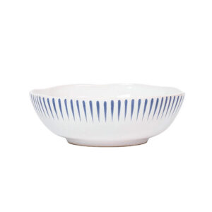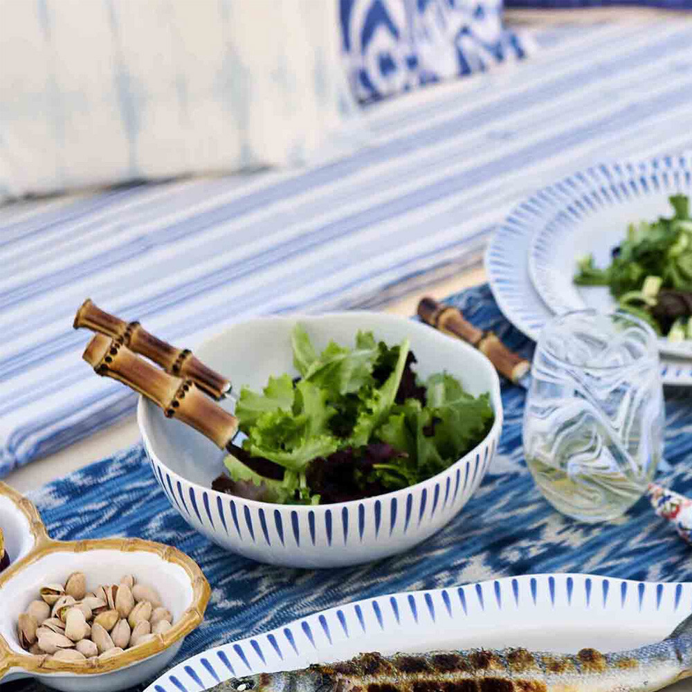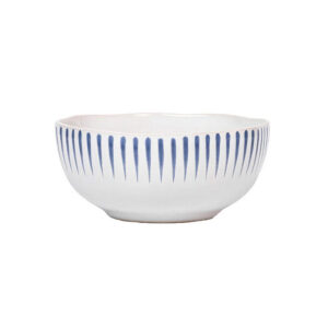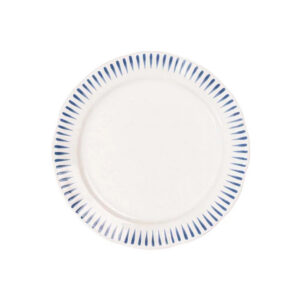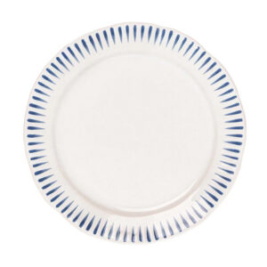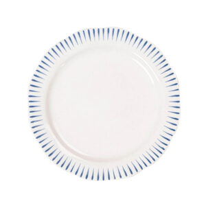 Inspired by the idyllic town of Sitio, Portugal, comes a fresh and relaxed pattern that puts an artistic exclamation point on everything in this dinnerware collection within its frame of radiating stripes in Delft Blue.