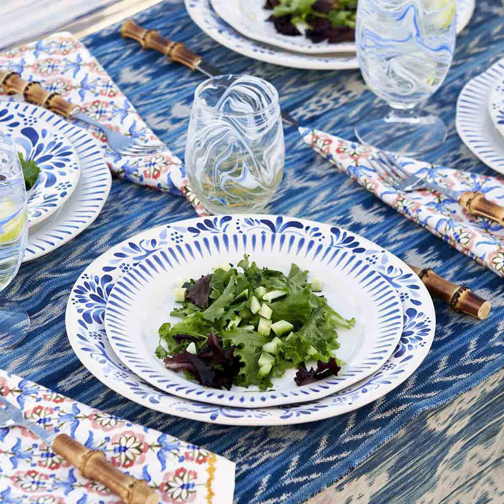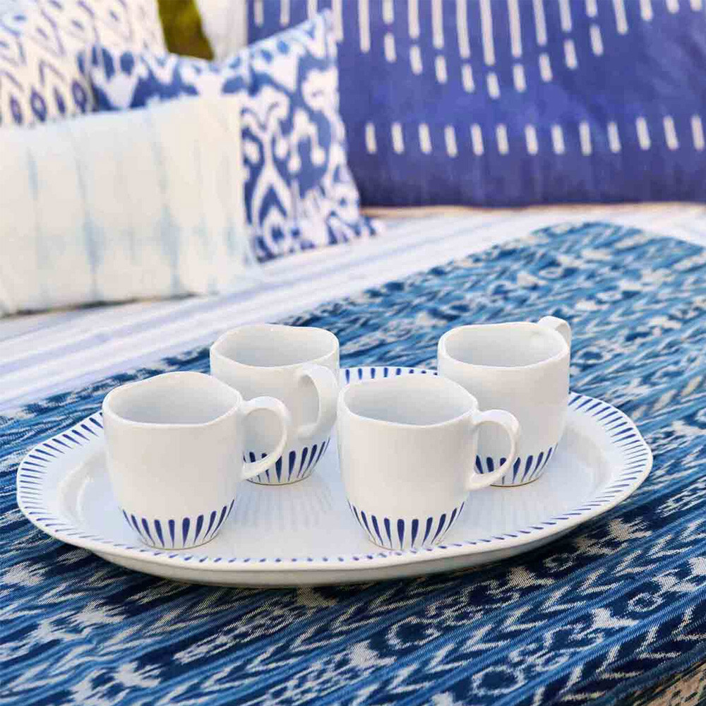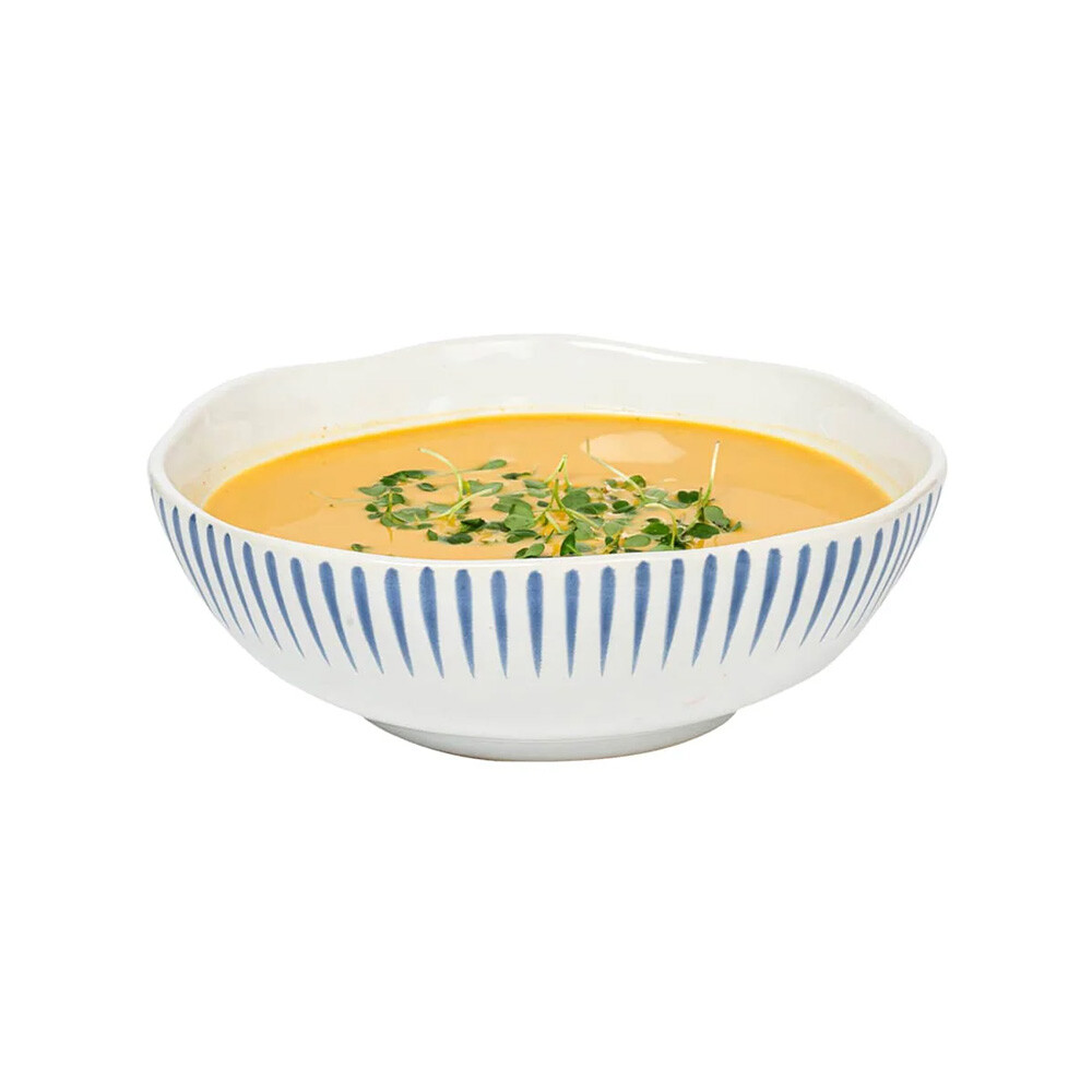 Inspired by the idyllic town of Sitio, Portugal, comes a fresh and relaxed pattern that puts an artistic exclamation point on everything in this dinnerware collection within its frame of radiating stripes in Delft Blue.