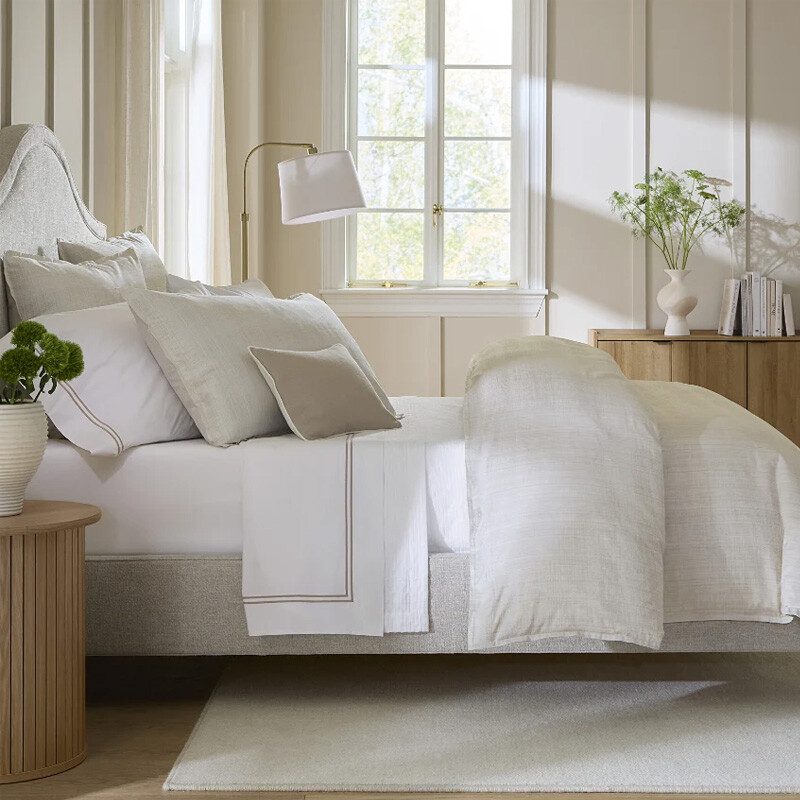 The comfort of home, wrapped in the ease of a beach holiday. Gianna is a glistening sateen jacquard woven from Italian long-staple cotton, its beige hue evoking the serenity of a sandy seaside escape. Inspired by the lightness of tropical retreats, its woven texture mimics the delicate beauty of rattan, creating a sense of breezy, effortless luxury.