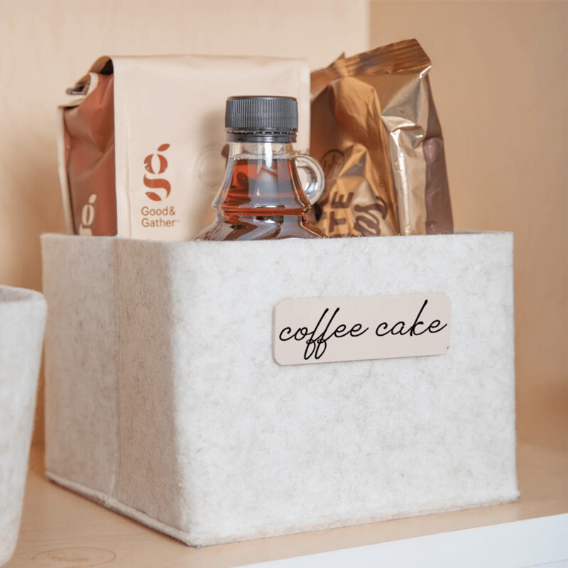 These Labels are attached with double pins through the bin material and can be used with our Flex and Handle Bins as well as other bins made of fabric that can be pierced! We suggest writing on these labels with wet-erase or waterproof chalk pens. Please note that the pin backings can be choking hazards and the pins themselves are sharp. Caution should be used around these items and they are not suitable for children. We suggest writing on these labels with wet-erase or waterproof chalk pens.