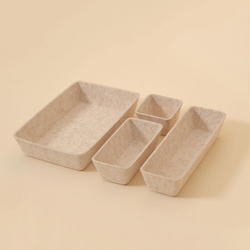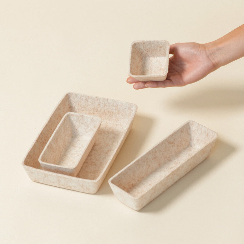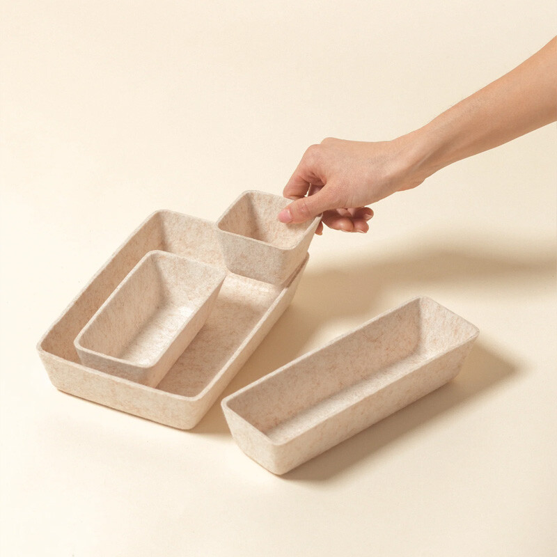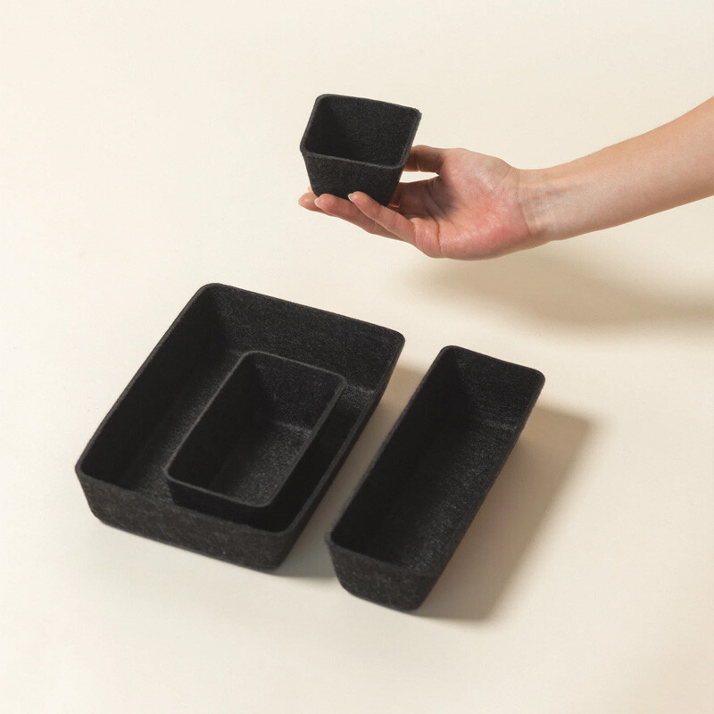 Our Sculpted Drawer Organizers are made of felt derived from post-consumer recycled plastic.