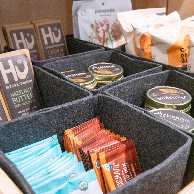These bins are made of felt derived from post-consumer recycled plastic. Contents include between 95-99% post-consumer recycled PET and 1-5% non recycled PET.