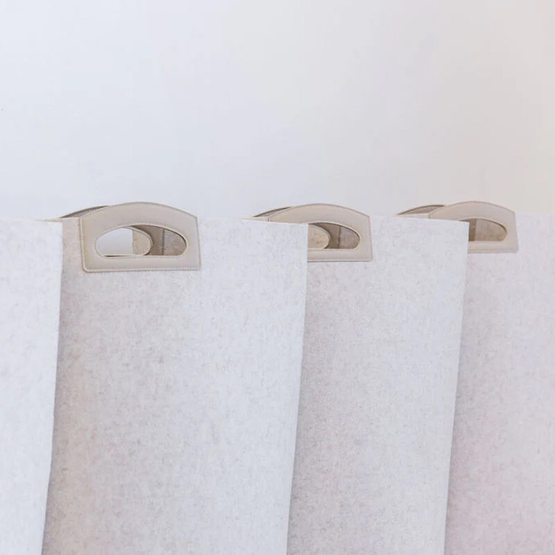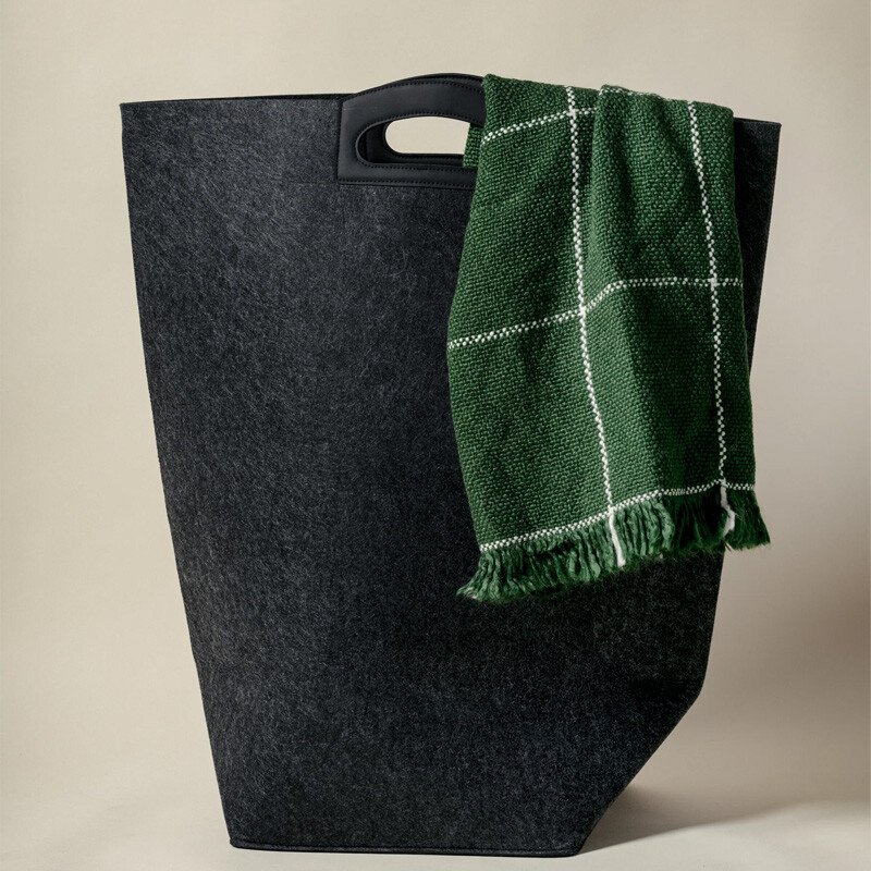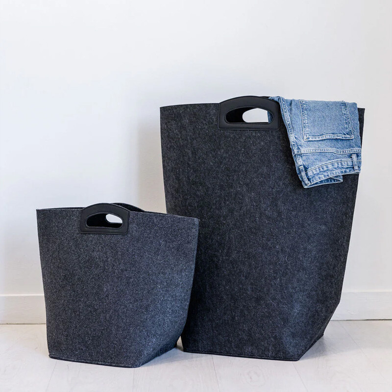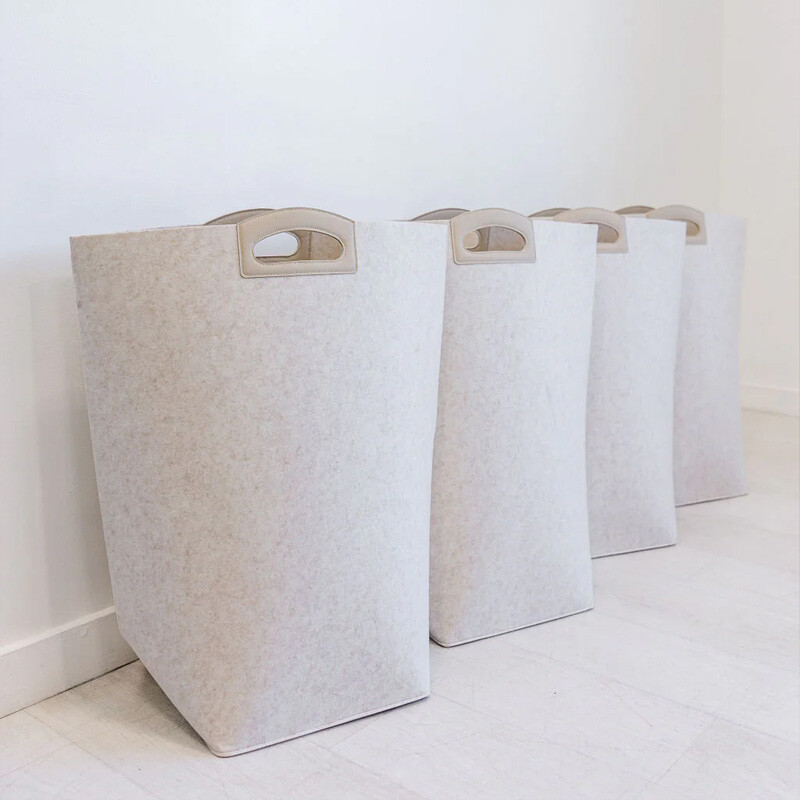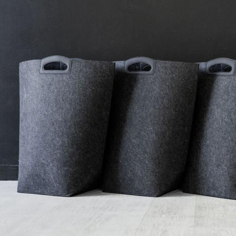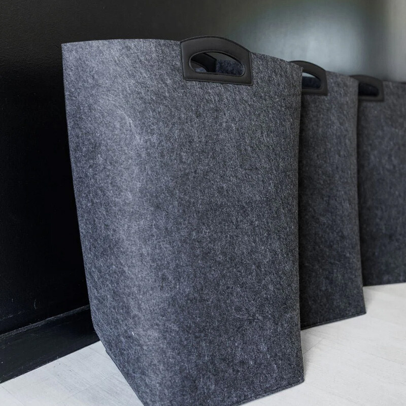 These bins are made of felt derived from post-consumer recycled plastic. The felt on these bins are between 95-99% post-consumer recycled PET and 1-5% non recycled PET. The vegan leather handle is made of 65% recycled material.