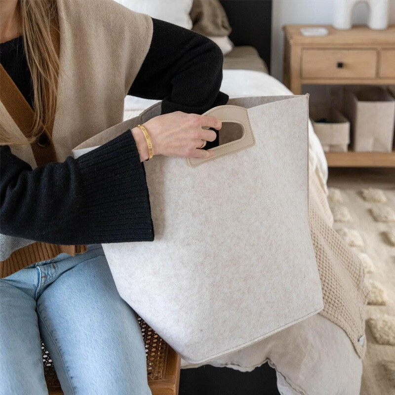 The Handle Bin combines practicality with style, featuring a convenient handle for easy transport and a sleek design that maintains its modern shape. This durable storage bin is perfect for organizing items like laundry, toys, or sports gear, ensuring your space stays tidy and elegant. It’s also a great car bin or tote to take to the farmers market! With its structured build, it provides a reliable and stylish storage solution for any home. These bins can be washed on cold, in this washing bag.