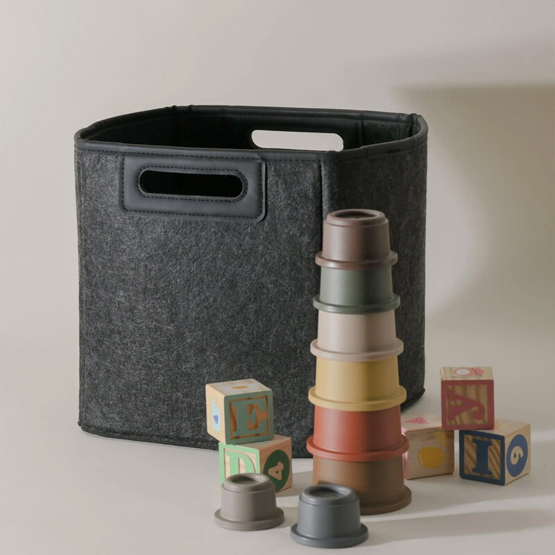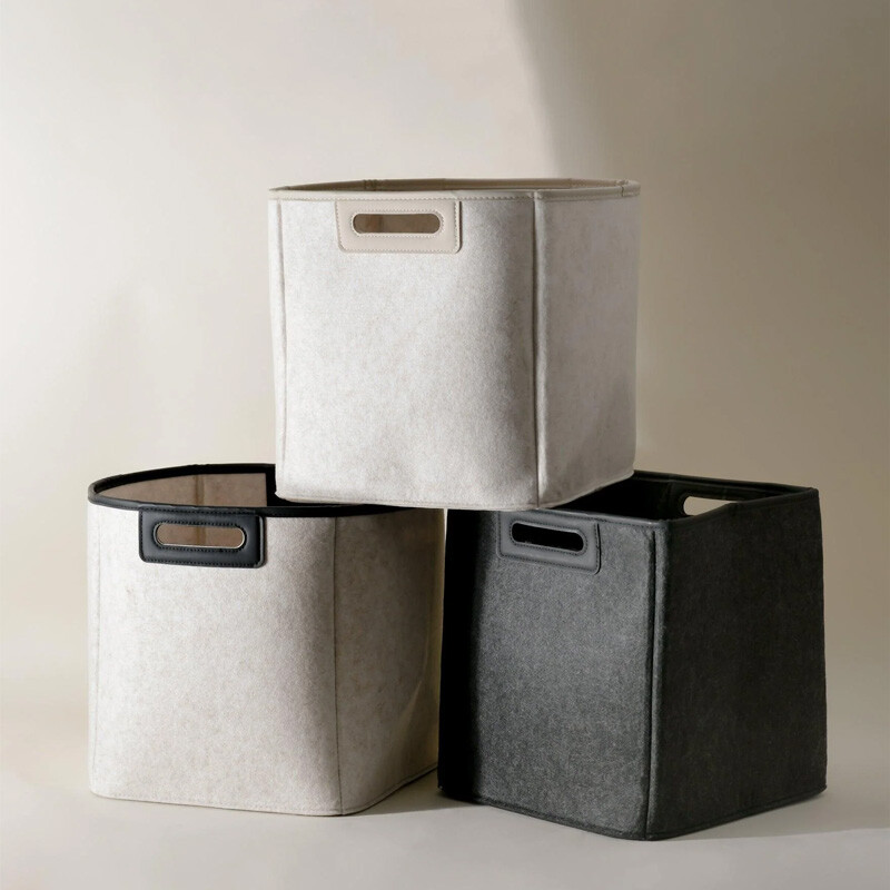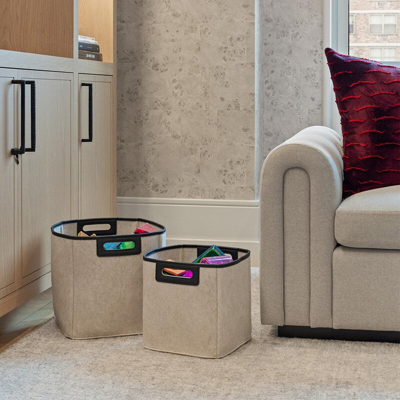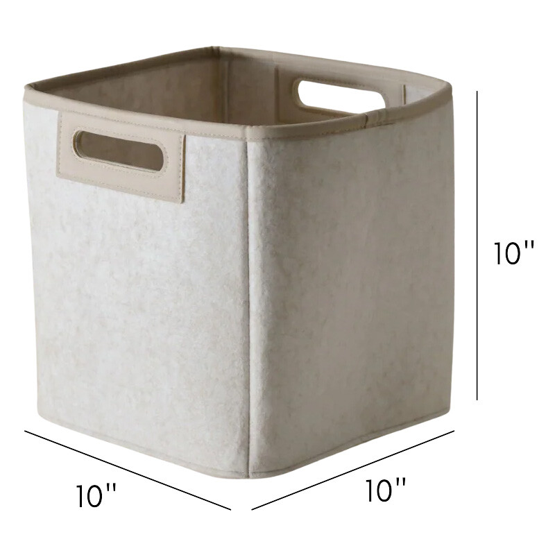 These bins are made of felt derived from post-consumer recycled plastic. The felt on these bins are between 95-99% post-consumer recycled PET and 1-5% non recycled PET. The vegan leather handle is made of 65% recycled material. Please note that due to the nature of this recycled material, there will be slight color variations in the fabric.