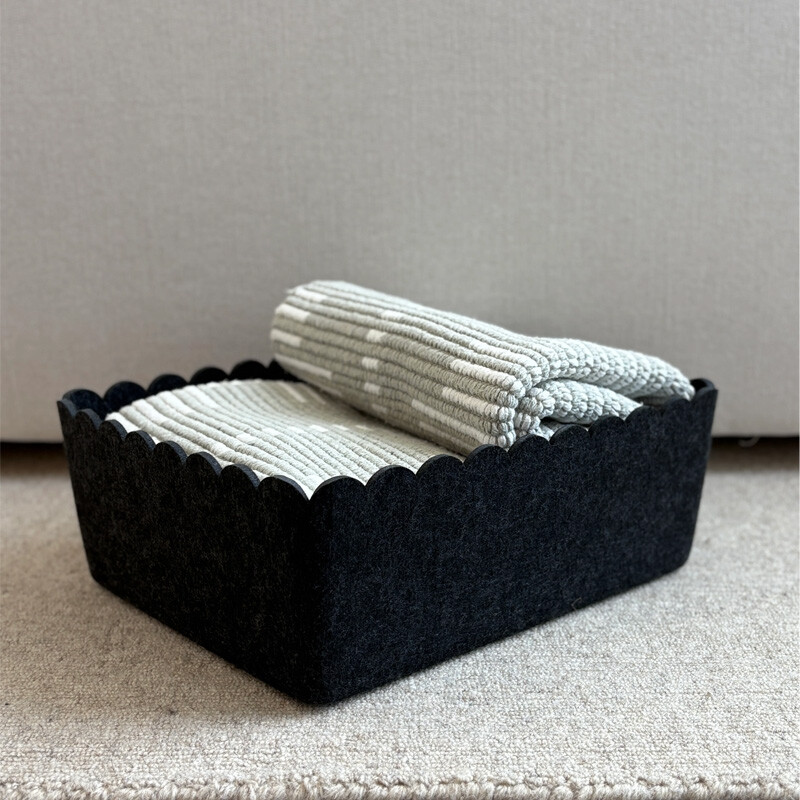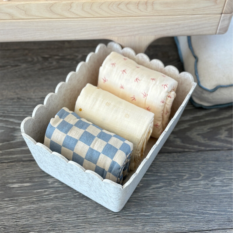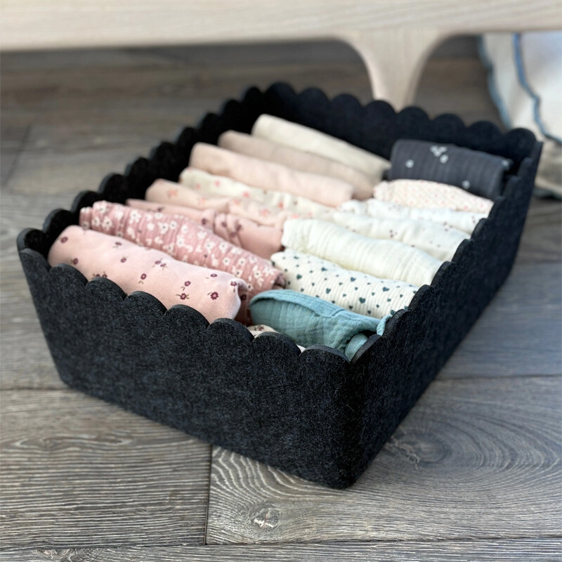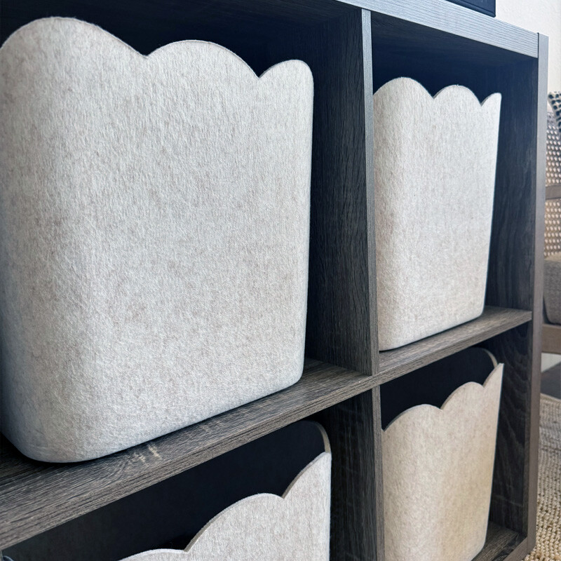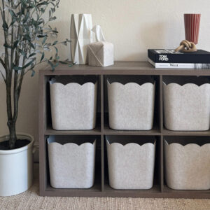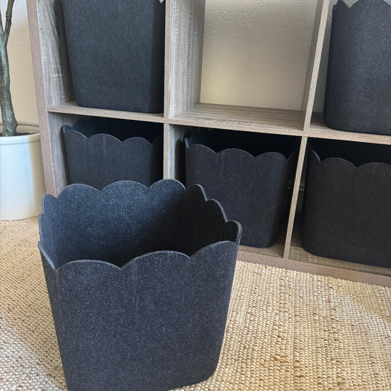 Our Scalloped Bins offer the same spacious, structured storage you love, now finished with soft scalloped edges for a more elevated and playful touch. Designed to maintain its modern shape, this durable felt bin provides a stylish solution for organizing clothing, toys, and kitchen or pantry essentials. The scalloped top adds subtle character while keeping your space neat, intentional, and clutter-free. Perfect for the playroom, kitchen, pantry, bedroom, living room, and beyond, this bin blends function and design—making everyday organization feel beautifully considered.