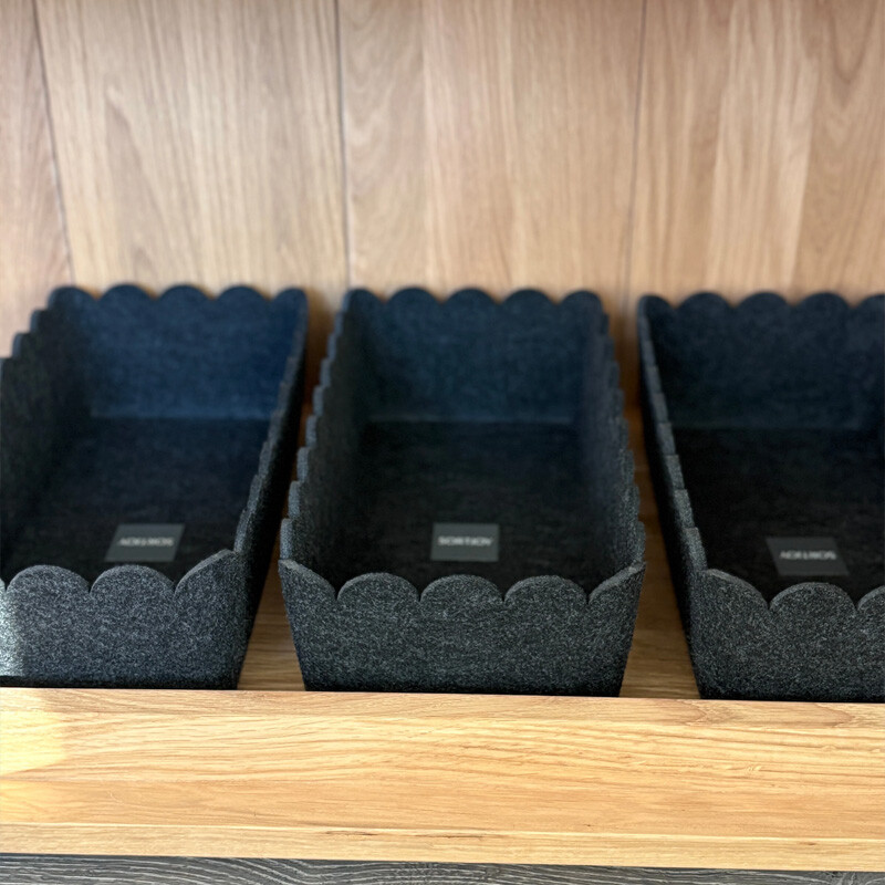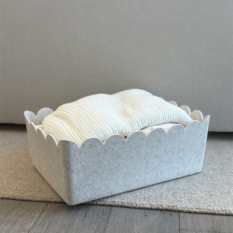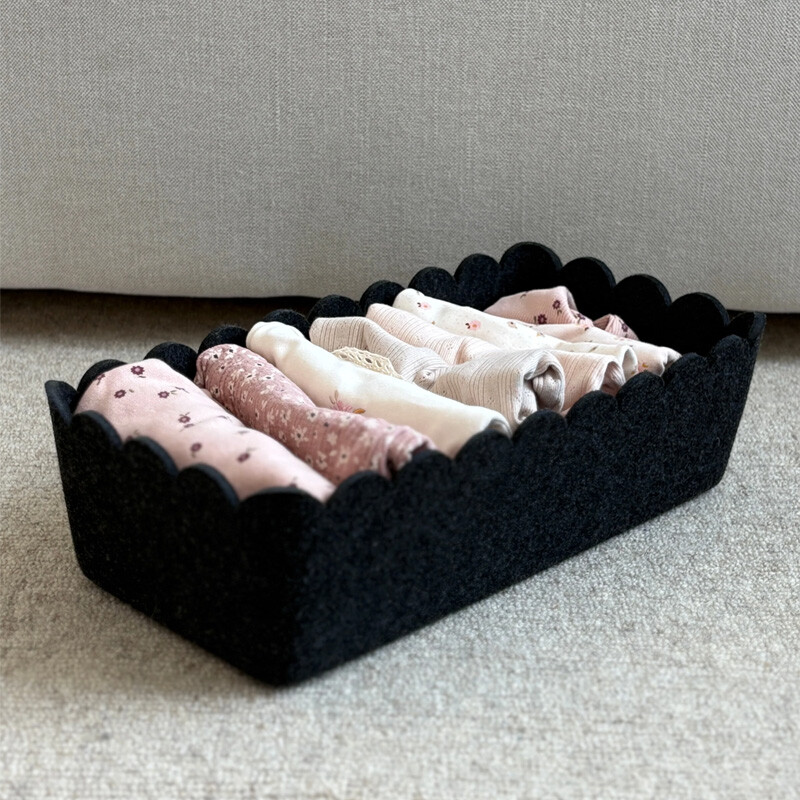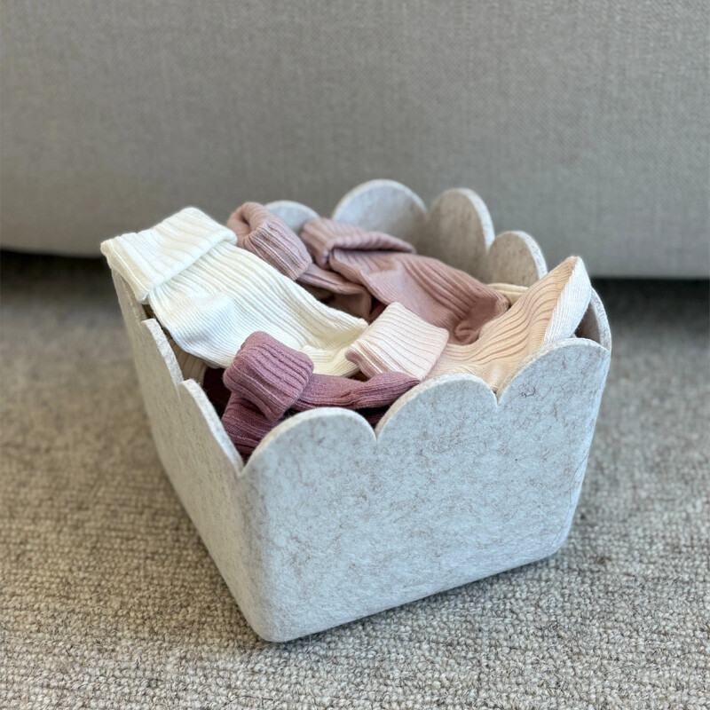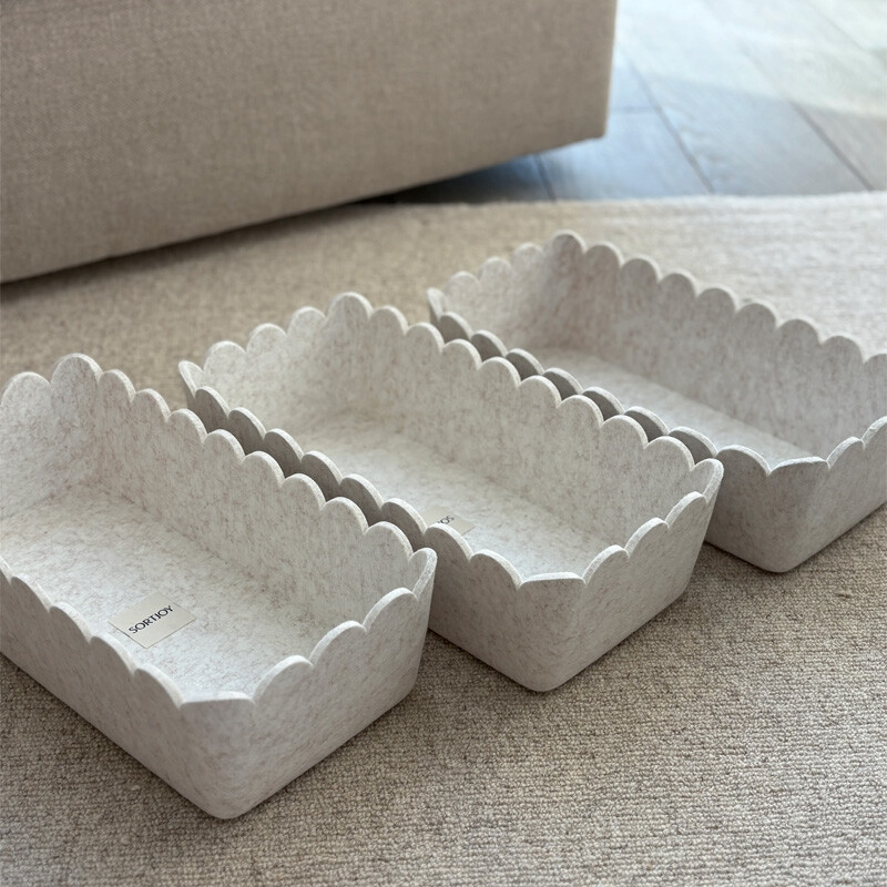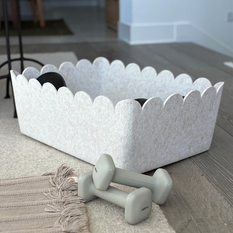Our Scalloped Bins offer the same spacious, structured storage you love, now finished with soft scalloped edges for a more elevated and playful touch. Designed to maintain its modern shape, this durable felt bin provides a stylish solution for organizing clothing, toys, and kitchen or pantry essentials. The scalloped top adds subtle character while keeping your space neat, intentional, and clutter-free. Perfect for the playroom, kitchen, pantry, bedroom, living room, and beyond, this bin blends function and design—making everyday organization feel beautifully considered.