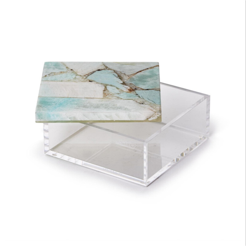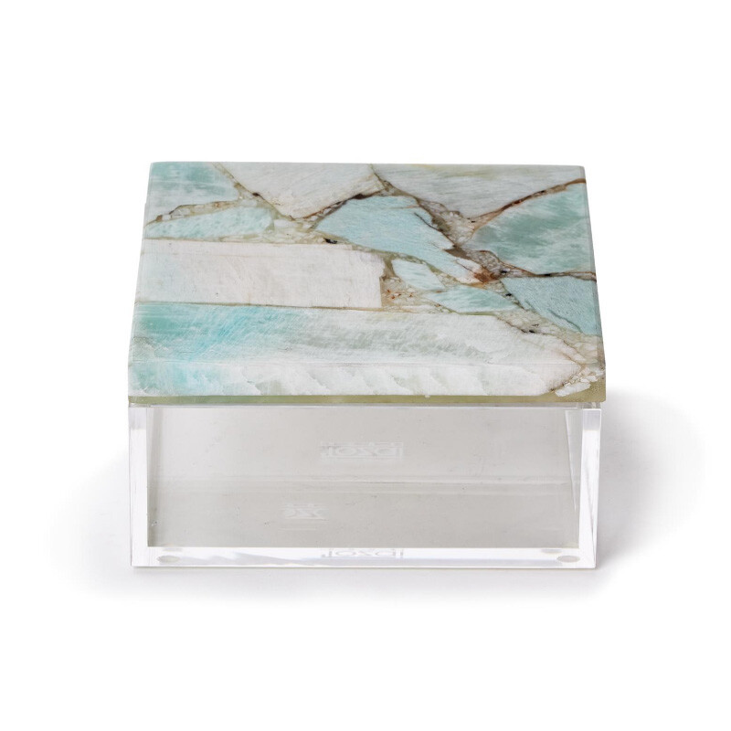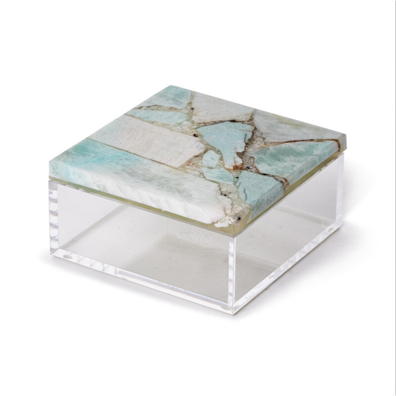 Elevate your home design with the exquisite sophistication of this genuine Amazonite covered box. This lustrous material exudes an innate beauty that transcends ordinary home accessories. Each acrylic base is covered with an Amazonite stone top offering a textured and enchanting addition to any space. Embrace the uniqueness of Amazonite, as each piece showcases its distinct variances in color and pattern, ensuring that no two are exactly alike.
